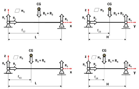 The outline specifying the data required for determining the position of the center of gravity, where —the center of gravity of the human body, πi—one of four side planes, R1, R2, R3, R4—a reaction in the scale support, fij—the position of the center of gravity on one of the side planes, L—scale length, H—scale width. For the used model Rx = 0 and Ry = 0.