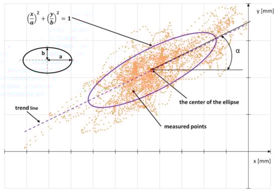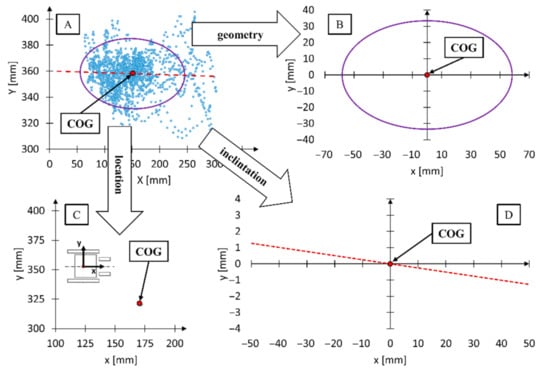 The research method required each patient to propel the wheelchair forwards (equal and simultaneous pushes of the left and right pushrim) with the constant speed of pushes amounting to 50 pushes per minute. For each tested wheelchair, the following three inclination angles towards the ground were simulated: 0°, 7°, 14°. One measurement test consisted of five full propulsion cycles [], during which the position of the center of gravity of the human body was determined with the sampling time of 0.01s. The outcome of each measurement test was the set of points depicting the position variability of the human body center of gravity in dynamic conditions, that is, propelling the wheelchair on the straight-line track. Such a set was replaced with an ellipse defined with such parameters as the position of the ellipse center xCOG and yCOG, semi-axis a, semi-axis b and the ellipse inclination angle α (Figure 6). The position of the ellipse center was determined by calculating the average value of the coordinate x and y of the points measured. The semi-axis length α constituted the double value of the standard deviation (2σ) of the coordinate x of the points measured, whereas, as far as the semi-axis b is concerned, its length corresponding to the double standard deviation (2σ) of the coordinate y of the points measured. Assuming the ellipse dimensions as the double standard deviation ensured the ellipse covering 95.4% of all the points measured. The ellipse inclination α corresponded to the inclination of the trend line determined based on all the measured points [,].