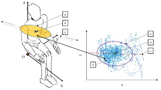The outline of the positioning of the analyzed ellipses within the tested patient body, where: a—ellipse which is the variability area of the position of the human body center of gravity, b—ellipse center, c—directional line, d—measured positions of the human body center of gravity during the measurement test.