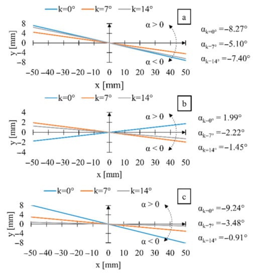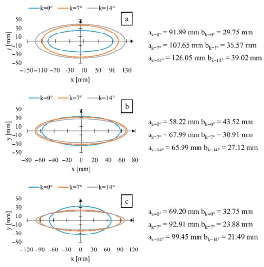The graphs of the ellipse directional lines, depending on the wheelchair inclination angle k for (a) wheelchair with the multispeed manual propulsion system, (b) hybrid propulsion system, (c) typical manual propulsion, where αk=0° —directional line inclination angle during propelling the wheelchair inclined at 0°, αk=7° —directional line inclination angle during propelling the wheelchair inclined at 7°, αk=14° directional line inclination angle during propelling the wheelchair inclined at 14°.