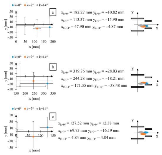 The diagrams of the position of the ellipse center describing the position variability of the human body center of gravity depending on the wheelchair inclination angle k for (a) wheelchair with multispeed manual propulsion system, (b) hybrid propulsion system, (c) typical manual propulsion system, where xk=0° and yk=0°—the coordinates of the position of the ellipse center during propelling the wheelchair inclined at 0°, where xk=7° and yk=7°—the coordinates of the position of the ellipse center during propelling the wheelchair inclined at 7°, where xk=14° and yk=14°—the coordinates of the position of the ellipse center during propelling the wheelchair inclined at 14°.