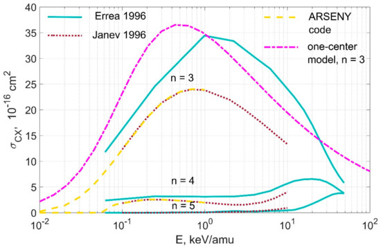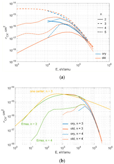 The curve names (“ory” and “old”) in the legend in Figure 1 refer to the filename in OPEN-ADAS [6,7] from which the data were taken. The files in OPEN-ADAS have names such as qcx#h0_*#be4.dat, where instead of * are the words specified in the legend. Thus, if the curve is labeled “ory” in the legend, it means that it is plotted from the data from the qcx#h0_ory#be4.dat file. The green curves (solid for the population of the atomic level with principal quantum number n = 3 and dotted for the population of level with n = 4) show the data from Errea 1998 [8], where the results for cross sections at low collision energies are available. The yellow curve shows the result of calculations within the one-centre model [5] for populating at the level of n = 3.