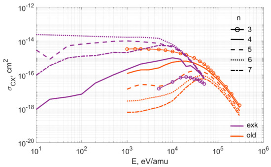 Figure 2 shows that the charge exchange cross sections for hydrogen in the excited state are higher than those for hydrogen in the ground state. In the first case, the largest cross section corresponds to the charge exchange with the population of level with the principal quantum number n = 6, in the second—the level with n = 3.