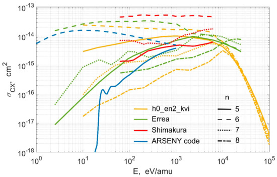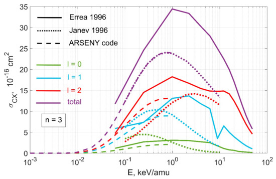 Figure 3, Figure 4, Figure 5 show the data from the qcx#h0_en2_kvi#be4.dat file from OPEN-ADAS for charge exchange from excited hydrogen with a population of levels with different n and l. In Figure 3, one can see a comparison of these data with cross sections from several other sources, while Figure 4 and Figure 5 show a detailed l-resolved comparison with calculations with the ARSENY code.