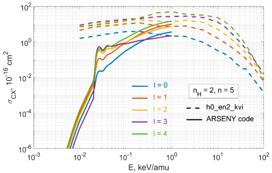 The charge exchange cross sections for reaction (2) with excited hydrogen for electron capture to the state with principal quantum number n = 5 and orbital quantum number l. Solid curves—calculations using the ARSENY code, dashed curves—data from qcx#h0_en2_kvi#be4.dat file [6,7].