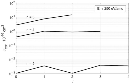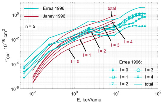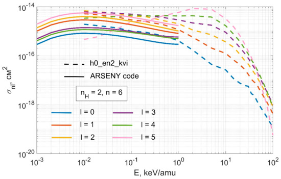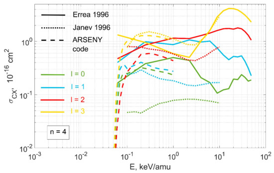 Figure 6, Figure 7, Figure 8, Figure 9 below show the comparison of charge exchange cross sections for reaction (2), taken from [10] and [11]. Figure 10 shows the dependence of charge exchange cross sections for reaction (2) on the orbital quantum number l for different values of the principal quantum number n.