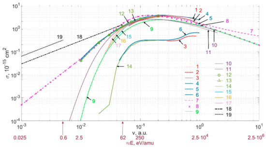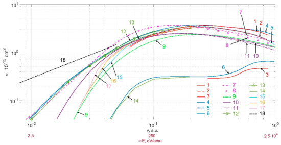 The figures in this section show the data for the cross sections for reaction (2), taken from the OPEN-ADAS database [6,7], and their comparison with cross sections from various sources, depending on the relative velocity v and the collision energy E, expressed in units of eV/amu (amu stands for the atomic mass unit). Collision energy E = 2.5 eV/amu corresponds to the relative velocity of colliding particles v ≈ 0.01 a.u. (1 a.u. ≈ 2.188 106 m/s); collision energy E = 1 keV/amu corresponds to v ≈ 0.2 a.u.