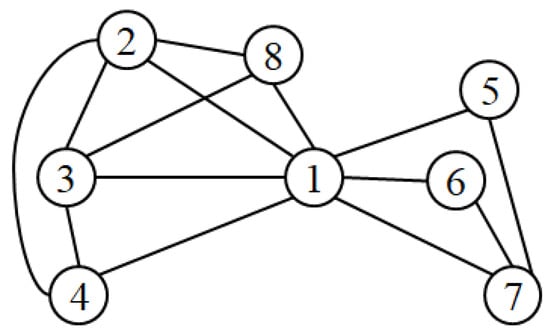 Example 1. In Figure 1, node has 7 neighbors, i.e., = {2, 3, 4, 5, 6, 7, 8}. Node has 3 neighbors, i.e., = {1, 2, 3}. Thus, node centrality of nodes and are = 7 and = 3, respectively. and are {2, 3} and {1, 2, 3, 4, 5, 6, 7, 8}, respectively. Thus, and . Hence, ; . Definition 7. If the gravitational degree of a node is no less than that of all its neighbors, the node will be called the local maximum degree node of the network.