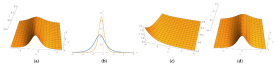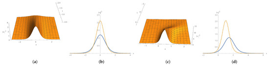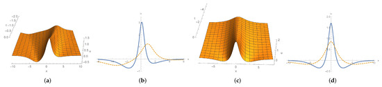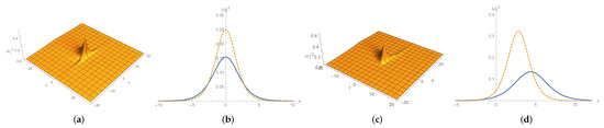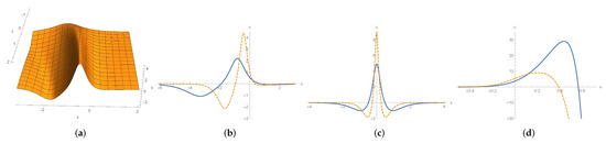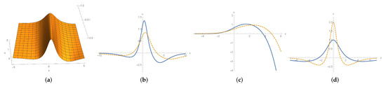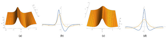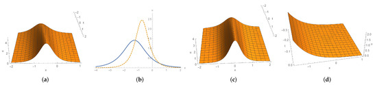 To continue we next consider (85c) and (85e). The solution (85c) is symmetric with respect to x and describes a stationary wave. With regards to the solution (85e), for fixed t, it tends to zero as and tends to ∞ as . We depict these solitons in Figure 6.