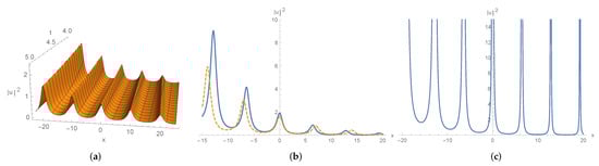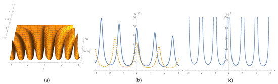 For the 2-soliton solutions (86) and Jordan block solutions (90), one can find that in (86c) and (90b) are even functions of x and describe stationary waves. We illustrate them in Figure 7 and Figure 8.