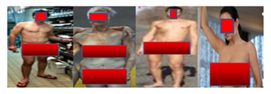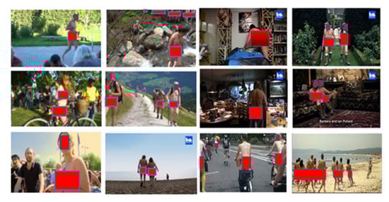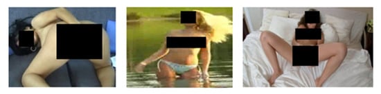 The NPDI pornography dataset [28,29] has been extensively used to train and evaluate various models to detect pornography in videos [7,9,10,11,12,13]. However, when the proposed models were used with real-life broadcasted movies for censorship purposes, the shortcomings of the existing methods and dataset have become evident. Although existing training strategies were able to classify pornographic videos into two classes—normal and nude—they were too simple to detect nudity with any scale and complex backgrounds in video frames. In other words, the NPDI dataset focuses mainly on pornographic content (sexual actions and exposure of genital organs) that covers the whole camera’s field of view. Therefore, when we utilised the models trained on the NPDI dataset for real-world films, they were unable to detect nude frames, thus producing a high false negative rate. The main reason was that CNN loses the focus on nudity content and instead, considers other objects in the backgrounds. Therefore, to overcome the previous limitations of the dataset, this paper proposes a new nudity dataset with the challenging content of various nudity scales and backgrounds.