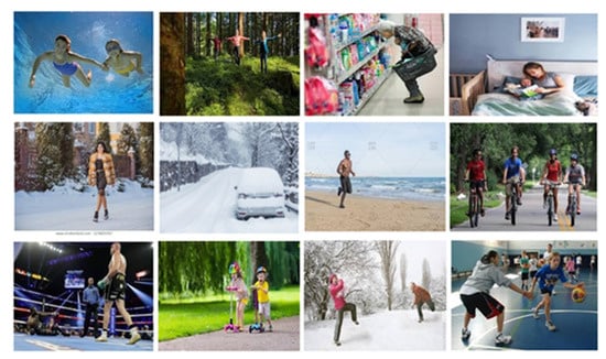 This dataset was used to train and validate the models in the ablation experiment that targets the study of adding YOLO3 in the pipeline before CNN. For CNN-only, the training samples were the whole images. On the other hand, YOLO–CNN used human-only patches that were extracted from the images by YOLO3. A few samples of the human-only dataset are shown in Figure 5.