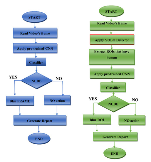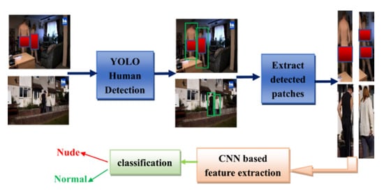 In this paper, we provide further insight into the nudity classification task that includes YOLO [41,42,43] to solve the problem of CNN-only methods. If the frame has more than one person, each person image patch is passed to the CNN to produce one category that is stored in a list. The list has labels of all person patches in one frame. If one element in the list has a nude label, the whole frame is considered nude, whereas if all labels in the list have normal elements, the whole frame is considered normal. Additionally, the proposed method detects nudity regions existing in different scales inside the frames with complex backgrounds. In other words, it can only edit and filter out only detected regions and keep other existing regions of the frame; thus, it reduces the interrupted period of the film and helps to understand the context.
