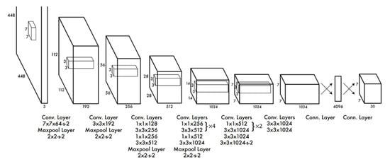 The YOLO network architecture was inspired by the GoogleNet model for image classification, comprising 24 convolutional layers followed by two fully connected layers instead of the inception modules used by GoogleNet, as shown in Figure 8. Convolutional layers were trained on the ImageNet classification with an input image of 224 × 224, and then the resolution was doubled for detection [41].