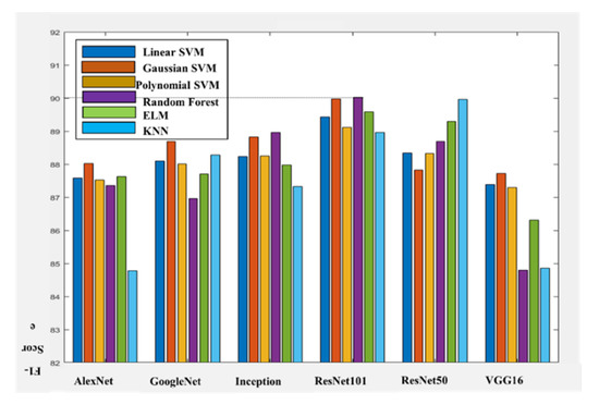 The results were compared with similar work presented in [7,10]. The authors in [7] employed AlexNet and GoogleNet with SVM for the pornographic dataset. In [10], they utilised ResNet50 and ResNet101 with Linear SVM. Therefore, in this paper, we replicated their models on our dataset to compare with the proposed feature extractors and classifiers. The best of the proposed models based on the F1-score were in the following order: ResNet101-RF (90.03%), ResNet101-GSVM (89.97%), and ResNet50-KNN (89.96%), as shown in Figure 14. The top three accuracies of 87.75%, 87.42%, and 87.66% respectively, which were underlined in Table 7, outperform the accuracies of state-of-the-art models including AlexNet-LSVM [7] (83.81%), GoogleNet-LSVM [7] (84.99%), ResNet50-LSVM [10] (84.94%), and ResNet101-LSVM [10] (86.53%).