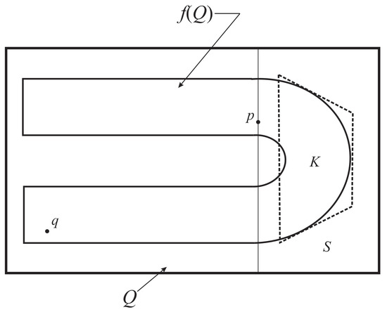 It is important to note that subrectangle S with its left vertical edge through p, which contains the arch of the horseshoe and the keystone region K, plays a key role in the dynamics of the iterates of f. In particular, we require that the map satisfy the following additional property, which is illustrated in Figure 2: