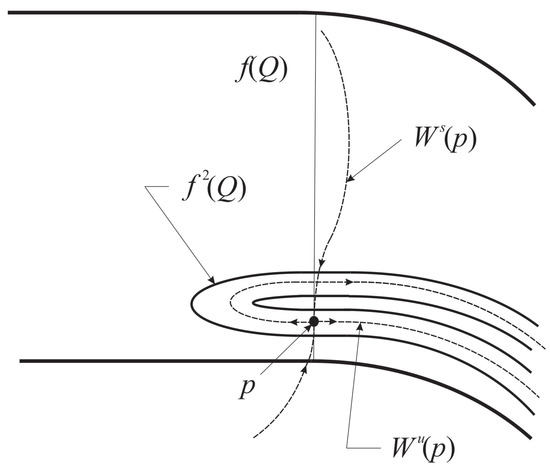 - f maps the keystone region K (containing a portion of the arch of the horseshoe) to the left of the fixed point p and the portion of its corresponding stable manifold containing p and contained in .