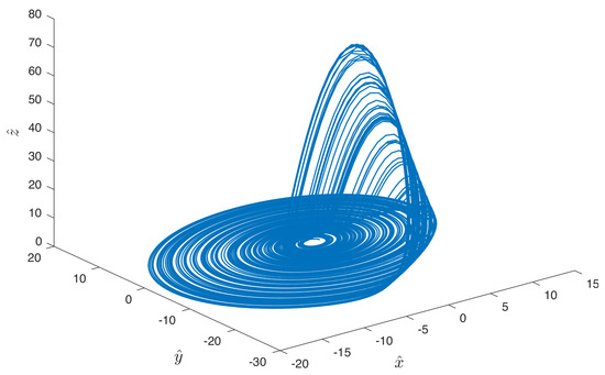where we use the parameters , , and . This produces the chaotic strange attractor in Figure 3, and it can also be realized by a rather simple electronic circuit.