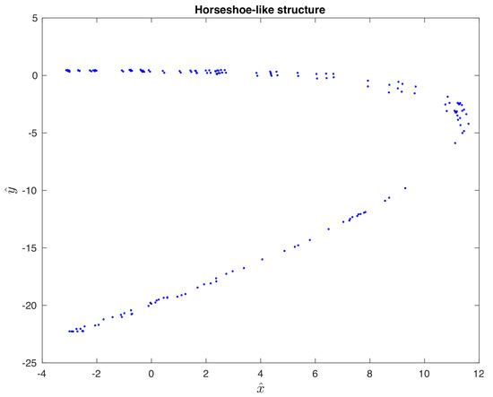 Poincaré section () of the Rössler attractor containing a horseshoe-like structure. Plot is shown in the rotated frame.