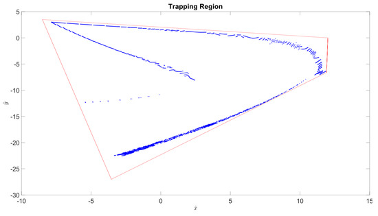 Now, if we can find a rotationally symmetric trapping region around this horseshoe, we shall have shown evidence for the existence of a GAH. First, we identify vertices of a quadrilateral that fully encompasses the horseshoe-like structure. Then, using a recursive algorithm (described in Section 2) we compute the first return map of those vertices on that particular Poincaré section, i.e., the first iteration of the Poincaré map of those points. If the iterates are contained within that quadrilateral, the points on the quadrilateral itself can be tested. In Figure 5, four-thousand points on the quadrilateral are iterated, and it is illustrated that this first return is completely contained in the quadrilateral. While this is not a proof, the grid spacing on the quadrilateral provides compelling evidence that this is a trapping region for the GAH.