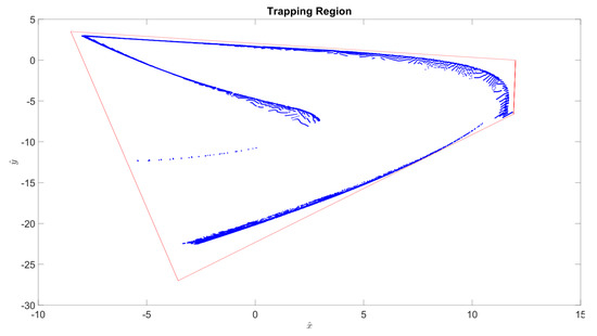 To produce a general Poincaré section of a flow, we break up the program into four parts: solving the ODE; computing a Poincaré section perpendicular to either , , or ; rotating the Poincaré section; and iterating the Poincaré map. Solving the ODE is standard through ODE45 on MATLAB, which executes a modified Runge–Kutta scheme. Once we have our solution matrix, we need to approximate the values of first return maps from the discretized flow. By restricting the first return onto a Poincaré section, the iterate space of the Poincaré map can be visualized. This is easily done for a section perpendicular to the axes, but in order to locate a highly specialized object, such as the GAH, we need to be able to rotate the section. Once the desired section is found we can experiment on iterating the points of trapping region candidates.