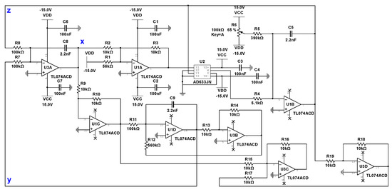 It happens that there are several known examples of electronic circuits realizing the Rössler attractor system. We chose the one, obtained from [11], shown in Figure 7 with a list of components in Table 1.