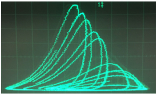 Next, we built the circuit and observed oscilloscope outputs as shown in Figure 9. The Poincaré section that we chose was a particular vertical plane through the top arch of the output shown (see also Figure 3). The acceptable planes were obtained by trial and error via varying the system parameters and rotation of the plane about a vertical axis through the apex of the arc.