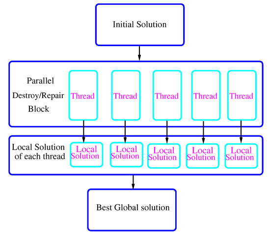 The need for parallel computing becomes inevitable despite the good results obtained with metaheuristics, due to the huge scale of the input data and the unexpected way of its change, which makes the objective function time-consuming. However, it is important to notice that the quality of the solution can be influenced. For instance, the major challenge is to find a parallelization strategy that solves larger problem instances in reasonable computing times and offers a consistently high level of performance over a wide variety of problem characteristics. In this context, several authors have proposed parallel techniques to tackle the combinatorial problems. Following these ideas, Bouthillier et al. [24] proposed a multi-thread parallel cooperative multi-search method founded on a solution warehouse strategy to deal with the deterministic VRPTW. Their method is based mainly on two cooperating classes of heuristics, namely tabu search and the evolutionary algorithms. In this regard, Røpke (2009) [25] applied a parallel ALNS to the traveling salesman problem with pickup and delivery and the capacitated vehicle routing problem such that each worker thread obtains a copy of the current solution and performs destroy and repair operations on its local copy in order to produce the best global solution. In the same spirit, Hemmelmayr (2014) [26]) proposed a parallel variant of the Large Neighborhood Search (LNS) to solve the periodic location routing problem. On the same topic, Pillac [27] presented a parallel version of the ALNS by adding a set covering post-optimization model that combines the tours generated throughout the search to assemble a better solution. It is worth mentioning here that the longer a heuristic is run, the better the quality of the solution is. Our contribution in this work is to study the balance between the quality of the solution and the corresponding execution time. Therefore, we suggest through our investigation a compromise between the required running time and the objective function. This can be viewed as a multi-criteria optimization problem.