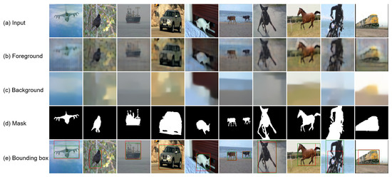 Visual results on the YTO dataset. (a): Input frame, choosing one frame for each of the ten categories; (b) foreground, output of our foreground network; (c) background, output of our background network; (d) binary segmentation mask, output of our binary mask model; and, (e) bounding box, green for the proposed method while red for the ground truth.