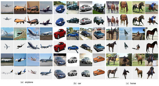 - The Object Discovery dataset [21]. The Object Discovery dataset is collected by automatically downloading images while using the Bing API, using queries for airplane, car, and horse. It contains 15k internet images: airplane (4542 images), car (4347 images), horse (6381 images), and it is annotated with high detail segmentation masks.