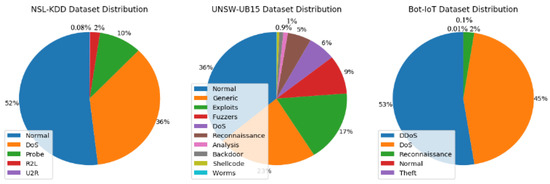 Despite the high accuracy obtained by shallow machine learning and deep neural network, NIDS models suffer high false-positive alarm rates and lower intrusion detection rates due to imbalanced datasets [9]. The data imbalance problem in datasets refers to the condition in which the distribution of classes is underrepresented. This condition occurs when one majority class is significantly outnumbered compared to the minority class, and the ratios can reach 1:100, 1:1000, or higher [10,11]. For instance, we have previously evaluated three benchmark NIDS real-world datasets: NSL-KDD [12], UNSW-NB15 [13], and Bot-IoT [14]. Figure 1 visualizes the distribution of each dataset. As can be seen, all suffer from high-class imbalance. The imbalance ratio reaches 1:534 between the majority and minority classes in the UNSW-NB15 dataset, while the highest imbalance ratio suffered by Bot-IoT is 1:26,750. Table 1 shows a complete description of the three benchmark datasets. This significant ratio of classes may mislead and bias the NIDS model during intrusion detection. Therefore, the minority class is not adequately learned, even in binary-class problems or multiclass classification [15,16,17].
