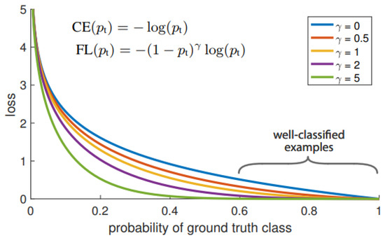 A combination of the cross-entropy and the modulating factor (1 − pt)^γ is used as it yields better accuracy, as mentioned in Equation (1). Figure 2 [27] shows the comparison between the cross-entropy γ = 0 and the focal loss. The weight term is inversely proportional and dependent on the value of pt.