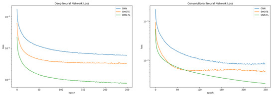 Imbalanced dataset has a huge influence on the ability of neural networks during training. The influence, which is affected by the majority class, is reflected by the late convergence of the loss function during the training process as the model sums the losses of all the large classes and rarely focuses on the minority class. By adding focal loss to cross-entropy loss, it reduces the large class contribution and extends the range to access the minority class. In this experiment, we compared and examined the cross-entropy of DNN using cross-entropy (DNN CE) from reference [6], CNN using cross-entropy (CNN CE) from reference [4], DNN using SMOTE (DNN SMOTE) from reference [21], and CNN using SMOTE (CNN SMOTE) from reference [21]; for DNN and CNN, focal loss with ɣ = 2.0 and α = 0.25 was used following reference [27]. Figure 4a,b shows the loss function compared to DNN and the loss function compared to CNN using the respective techniques. Both models that utilized focal loss converged faster compared to DNN CE, CNN CE, DNN SMOTE, and CNN SMOTE. In addition, the proposed model obtained minimum loss errors that were 7 times better for the DNN architecture and 3.7 times better for the CNN architecture than CNN SMOTE. It also had better generalizability, as shown by the validation losses. The detailed loss error and loss validation are shown in Table 5.