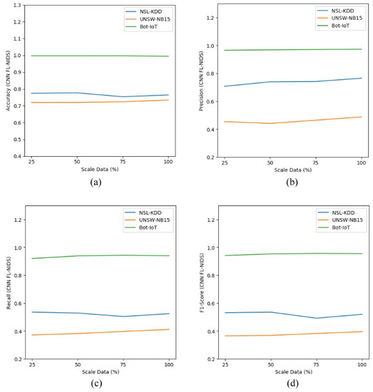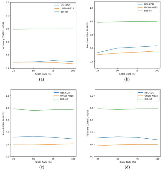 As depicted in Table 12 and Table 13, the scalability assessment of the proposed approach was conducted by comparing the performance of the DNN and CNN models using different data sizes. The performance comparison consisted of accuracy, precision, recall, and F1 score in multiclass classification. The results, shown in Table 12 and Table 13, indicate that our proposed approach is stable enough as the outcome achieved was almost the same, even for the model trained with few data. Figure 5a–d and Figure 6a–d show the performance comparison for FL-NIDS in the DNN and CNN models, respectively. From the presented results, it can be seen that the performance of the proposed scheme is scalable enough as the accuracy of FL-NIDS could be maintained at 74% for DNN and 77% for CNN, even with the availability of only 25% of the data size for training.