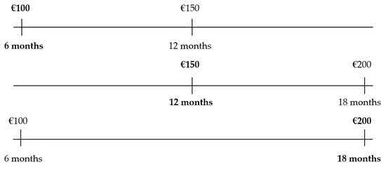 Under the interval effect, a decision-maker could prefer EUR 100 to EUR 150 and, moreover, he or she could prefer EUR 150 over EUR 200. Both choices are separated by a time horizon of 6 months or, in other words, they are separated by an interval of a length equal to 6 months. However, we can find a third intertemporal choice, in which the decision-maker must choose between EUR 100 within 6 months and EUR 200 12 months later (that is, in 18 months). In this case, the decision-maker could opt to choose EUR 200 and wait for 12 months more. As indicated, in the 6 month intervals, the decision-maker could prefer the earliest option while, in the 12 month interval, the decision-maker could prefer to wait. It can be observed that, for the smallest interval, the earliest option is chosen, and for the largest interval, the latest option is preferred, giving rise, as in Example 1, to time inconsistency.