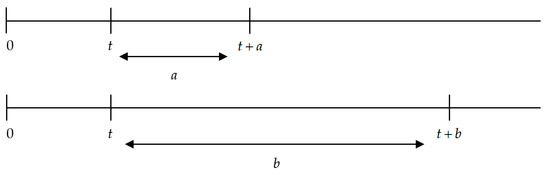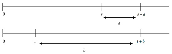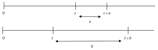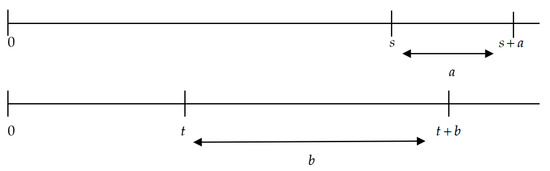 Let s denote the left endpoint of the shorter interval (of length a), and let t denote the left endpoint of the larger interval (of length b). Therefore, . If, moreover, , then we can provide the following definition.