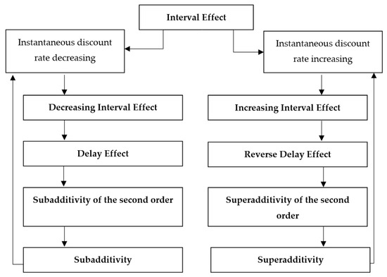 In effect, the previous analysis allows us to claim that the former analyzed cases could be descriptive of the so-called interval effect, regardless of whether the discount rate increases or decreases. However, it is necessary to make a distinction, as a given discount function cannot simultaneously fit both situations. Therefore, the interval effect could be classified as follows: