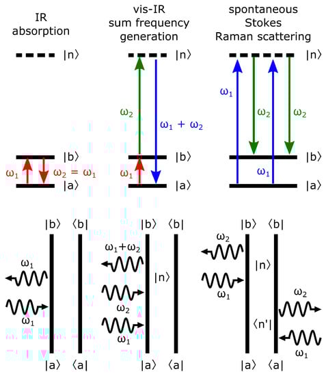 Figure 2 provides energy level and double-sided Feynman diagrams illustrating the interactions associated with the three spectroscopic techniques that we consider in this comparison. The first case illustrates that IR absorption spectroscopy is a probe of the linear polarizability . Absorption of an IR photon causes a transition from the ground vibrational state to an excited vibrational state . The emitted photon has the same frequency, polarization, and wavevector as the exciting photon, and hence this self-heterodyne experiment provides direct access to Ⅱm. In visible–infrared sum-frequency generation, a broadband or tuneable IR beam is spatially and temporally overlapped with a typically fixed frequency visible beam. In the absence of inversion symmetry, this generates light at the sum of the two input frequencies, proportional to the second-order susceptibility , through interaction with a non-resonant electronic virtual state . Intensity-only detection schemes measure a signal proportional to , while phase-sensitive detection provides access to Ⅱm [,,,,,]. Of the large family of Raman scattering probes, we consider the case of spontaneous Raman scattering where the Stokes-shifted wavelengths are detected. Although the intensity of the detected light (frequency in Figure 2) is linearly proportional to the intensity of the pump beam (frequency ) [], the observables commonly associated with Raman spectroscopy reveal that this is in fact a probe of Ⅱm, and is associated with four light-matter interactions [,].
