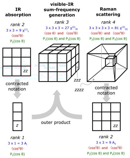 The point to note is that, before the ensemble average can be considered in Equation (3), it is required to project from the molecular frame in which it is defined into the laboratory frame to arrive at , thereby encoding the molecular orientation. The manner in which these projections are performed is related to the light–matter interaction accompanying each of the processes. As a result, different spectroscopic techniques have different symmetry properties, sensitivity to molecular orientation, and fingerprinting abilities.