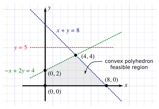Linear programming (LP) belongs to the class of convex optimization techniques that is known to provide exact solutions to problems that are challenging to solve using other methods, either due to the inherent complexity of the function to be minimized, or due to the number of local minima in the multidimensional parameter/error space [,,,]. In addition, LP can provide solutions in time, compared to traditional techniques [,,] that can require time. An example of a small LP problem that is convenient to visualize is minimization of the two-dimensional objective function