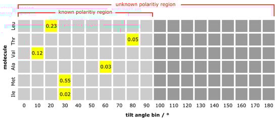 An illustration of the semi-discrete parameter space that comprises a single mixture. In the case of molecules with known polarity, we consider the range to in discrete steps of . In the case of unknown polarity, the tilt angles in the range to may be selected for each molecule. A fraction of each molecule (yellow squares) is then chosen as a weighting factor to generate the mixture. The mixture in the example shown contains 55% methionine tilted at as its largest component, and 2% isoleucine tilted at as its smallest component.