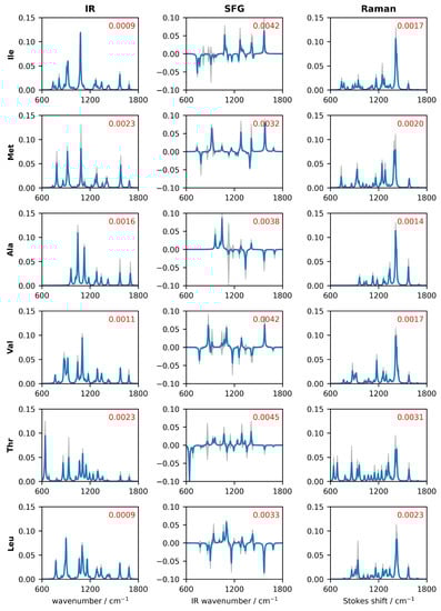 Further insight into this result may be obtained by plotting the spectrum obtained by averaging over all tilt angles (blue traces in Figure 6) along with the standard deviation about the mean (grey trace in Figure 6. Vector normalized spectra are used to allow for comparison between the three techniques. Visual inspection alone suggests that for all molecules the SFG spectra display the highest spectral variation across all tilt angles. This is numerically highlighted with the spectral deviation averaged over all frequencies , where SFG is the highest in all cases. Otherwise, the averaged standard deviation does not reveal any consistent trend between IR and Raman. For example, for the case of isoleucine (Ile) we obtain for the set of z-polarized IR spectra, for the set of z-polarized SFG spectra, and for the z-polarized Raman spectra. In this case we may conclude that spectral variation follows the trend of SFG > Raman > IR. For methionine (Met), this changes to SFG > IR > Raman, indicating that there is no general trend. Regardless, the point is that the largest variation is not observed in the Raman spectra, supporting the conclusion made using the Pearson’s correlation coefficient.