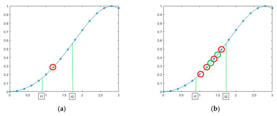 (2) In order to ensure that the sampling points was not repeated and there were no empty points, it was necessary to set the optimal sampling order of resampling, that is, the number of sampling points per revolution of the input axis. As shown in Figure 1, it showed the influence of the selection of inappropriate sampling order on the sampling effect, the red circle represents the points that do actually exist after resampling, while the green circle represents the points that do not actually exist after resampling. Figure 1a showed the condition that the sampling order was too low, some points of resampling signal were missed, so the signal characteristics cannot be accurately described. Figure 1b shows the situation of an excessively high sampling order, and according to the principle of related sampling, the repeated sampling did not only waste the subsequent computing efficiency, but also affected the performance of signal feature description.