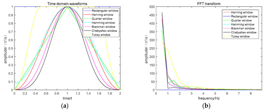 The selection of structural elements depended on the morphological characteristics of the original signal. The two key elements of structural elements are length and height. Linear and triangular structural elements are widely used in vibration signal processing of rotating equipment. The height of linear structural elements is zero, and only its length changed. The length and height of triangular structure elements will vary with the size, and the analysis effect is better than that of linear structure. However, the length of triangular structure elements can only be odd, which is discontinuous in the length direction and cannot be matched accurately. The essence of linear and triangular structural elements is rectangular and triangular Windows. There are two main indexes to evaluate a window function as structural element: (1) The width of the main lobe should be as small as possible; (2) the side lobe height as low as possible. The side lobe of rectangular window and triangular window are larger than others, so there are certain defects. In this paper, several common window functions were compared to find the optimal window function as the structural element. Common window functions include rectangular window, triangle window, Hanning window, Hamming window, Blackman window, Chebyshev window, Tukey window, etc. MATLAB software was used to draw the time-domain waveform and FFT spectrum diagram of the above window function, as shown in Figure 3. Figure 3a is the time domain waveform of each window function, and Figure 3b is its FFT spectrum diagram.