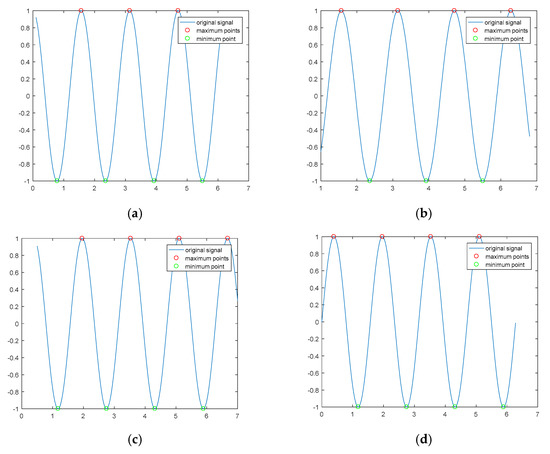(3) The two ends of the original signal are cut off according to the distribution characteristics of the maximum and minimum points. The distribution characteristics between the maximum and minimum points can be divided into four types, as shown in Figure 5.