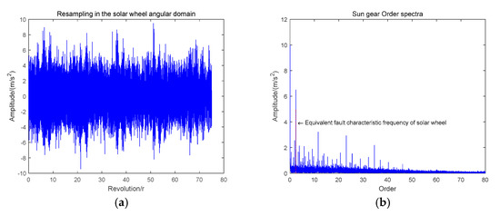The turn domain resampling signal was equal Angle domain signal, compared to the original signal, the sampling frequency of the resampling signal was the number of sampling points per revolution of the input axis. The equivalent fault characteristic frequency of sun wheel fault as follows.