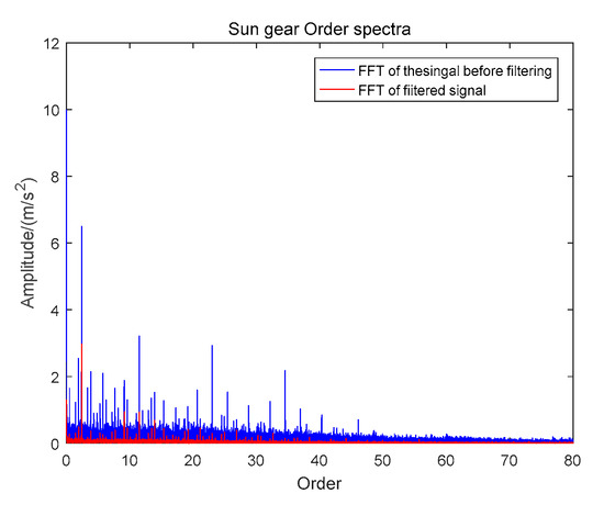 Figure 8 was the resampling signal and the resampling FFT transformation diagram of sun wheel fault. The equivalent frequency of 2.5 Hz can be found from Figure 8b. Therefore, the effectiveness of the method can be verified. It can be seen that from Figure 8b, in addition to the initial equivalent failure frequency in the envelope spectrum, there was also an impact at 11.5 Hz, and the impact was relatively obvious. For preserve only the fault signal of the sun wheel in the resampling signal, the way of the VMSMF is used which proposed in this paper to further reduce the noise.