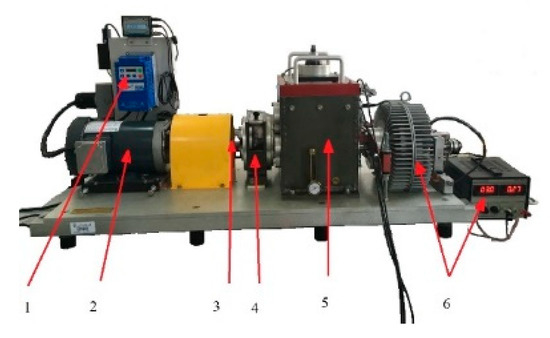 Comprehensive test bench for power drive fault diagnosis. 1 peed control device, 2 drive motor, 3 bearing seat, 4 secondary planetary gearbox, 5 fixed shaft gearbox, 6 load device.