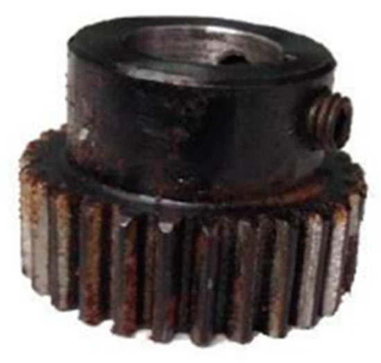 To further verify the effectiveness of the method presented in the paper, the powertrain fault diagnosis integrated test bench (Spectra Quest, Charlottesville, VA, USA) data shown in Figure 12 was used for testing. The laboratory furniture consists of speed control device, drive motor, bearing seat, secondary planetary gearbox, fixed shaft gearbox, load device and so on. Relevant parameters of each gear in the planetary gearbox are consistent with simulation signal parameters, as shown in Table 3. Figure 13 showed the speed change of the input shaft of the gearbox. Figure 14 is a picture of the faulty gear. Data within 10–20 s are analyzed in the paper. The parameters set and calculated in the experiment are shown in Table 5.