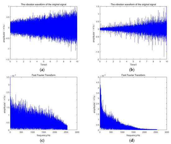 The original signal of the planetary gearbox. (a) is the time domain signal of the original health components; (b) is the time-domain signal of the original solar wheel wear state; (c) is the FFT transform spectrum diagram of the original health components; (d) is the FFT transform spectrum diagram of the original solar wheel wear state.